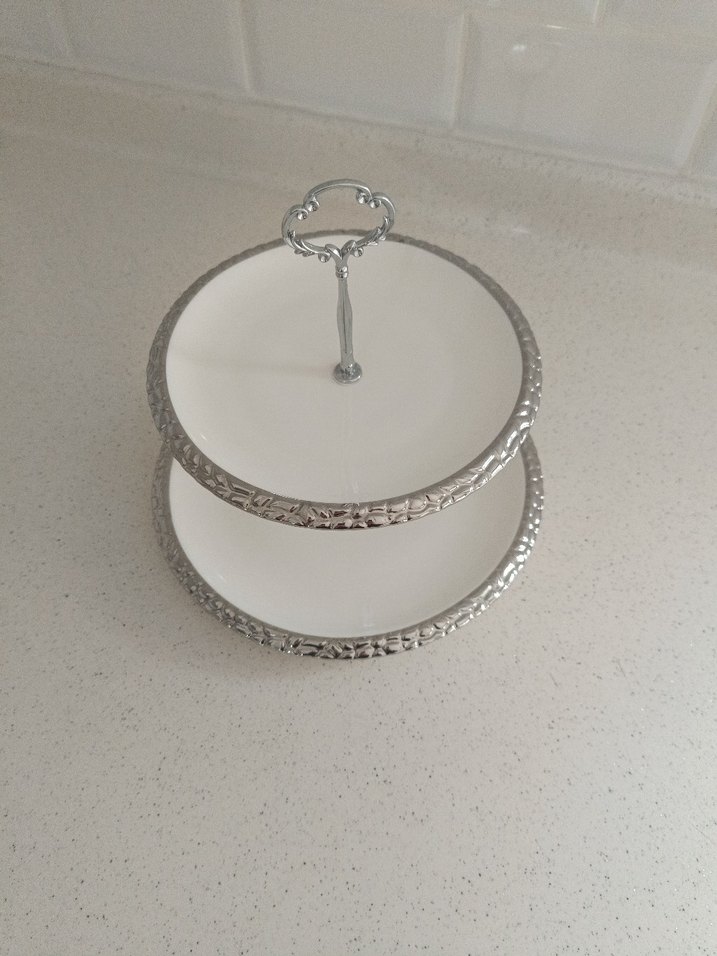 Beyaz ve gri renkte, dekoratif saplı 2 katlı mutfak servis tabağı, atıştırmalık veya tatlıları düzenlemek için uygun. ️