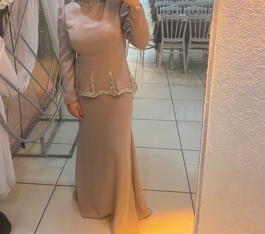 Boncuk işlemeli, uzun kollu, yüksek yakalı siyah abiye elbise, modern klasik kesimle şık ve mütevazı bir görünüm sunar. ✨ 0 sıfır fiyatı 5250