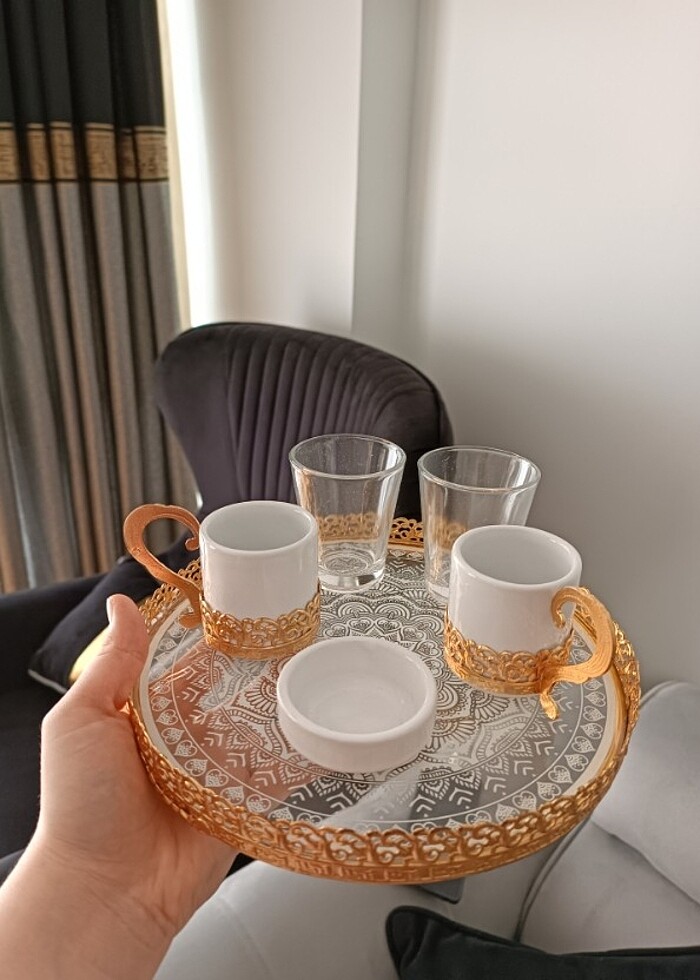 2 fincan 2 kahve yanı su bardağı 1 adet lokumluk ve 1 tepsi