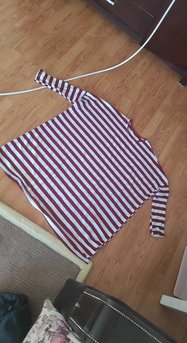 Bordo ve beyaz çizgili bluzu, uzun kollu ve kayık yaka tasarıma sahiptir. Triko dokusu ve salaş kesimiyle günlük kullanıma uygundur.