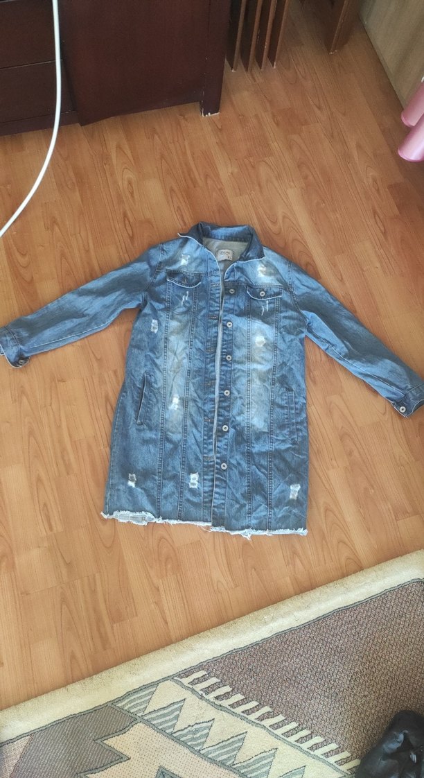 boyu 88 cm Düğmeli, uzun kollu, notalı yaka tasarımlı, bol kesim kadın midi denim ceket. Parlak mavi renkte, hafif yıpranmış detaylarla günlük sokak stiline uygun.
