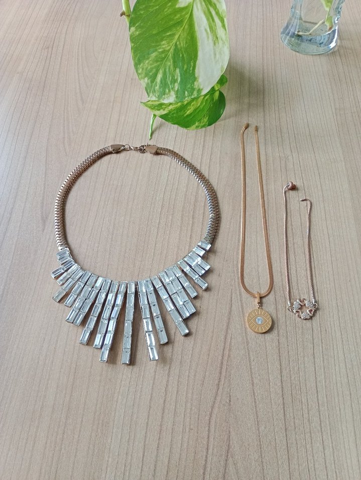 Kısa uzunlukta, altın renkli, payet detaylı, minimalist ve bohem tarzda günlük kullanıma uygun kadın kolye. ✨ büyük olanın sıkıntısı kusuru yok... diğer ikisinin takmaı yerlerinde kırıklık var