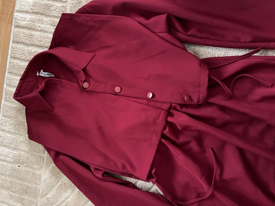 Bordo renginde, satenimsi dokulu ve parlak görünümlü, düğmeli, uzun kollu, normal boy elbise Salaş kesimi ve klasik yaka detayıyla günlük kullanıma uygun.