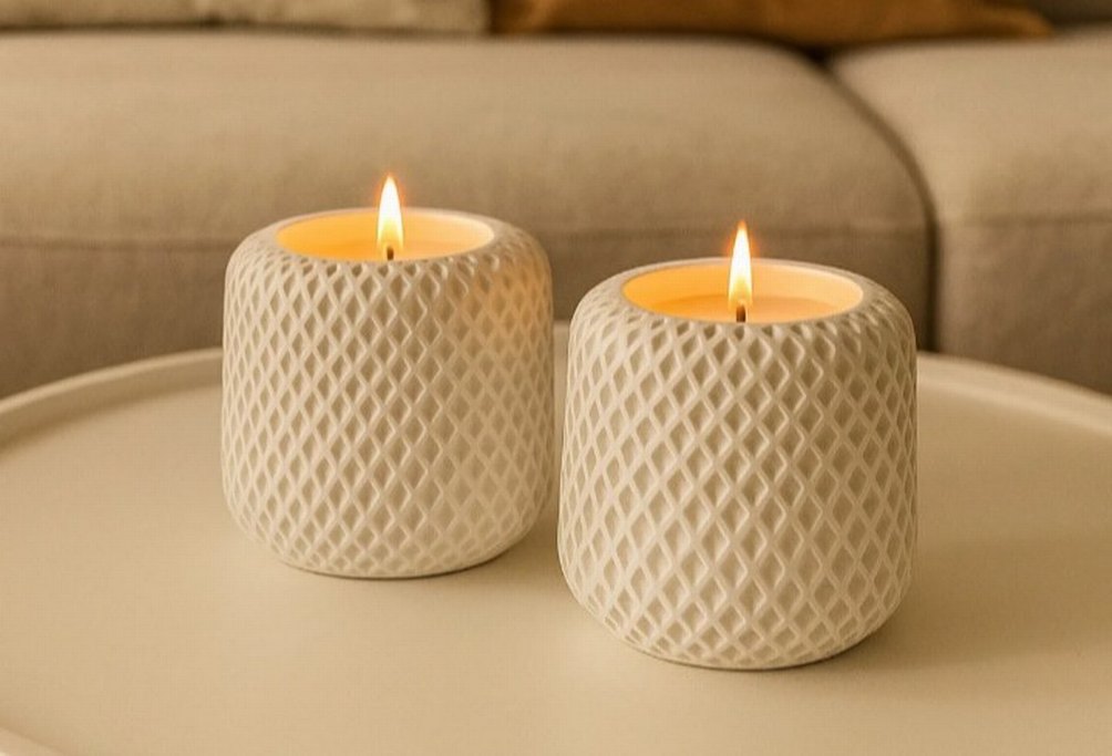 İki adet beyaz dokulu mumluk ve yanan mumlar, sıcak bir ortam yaratır. Mumluklar hafif kafes desenine sahiptir. ️