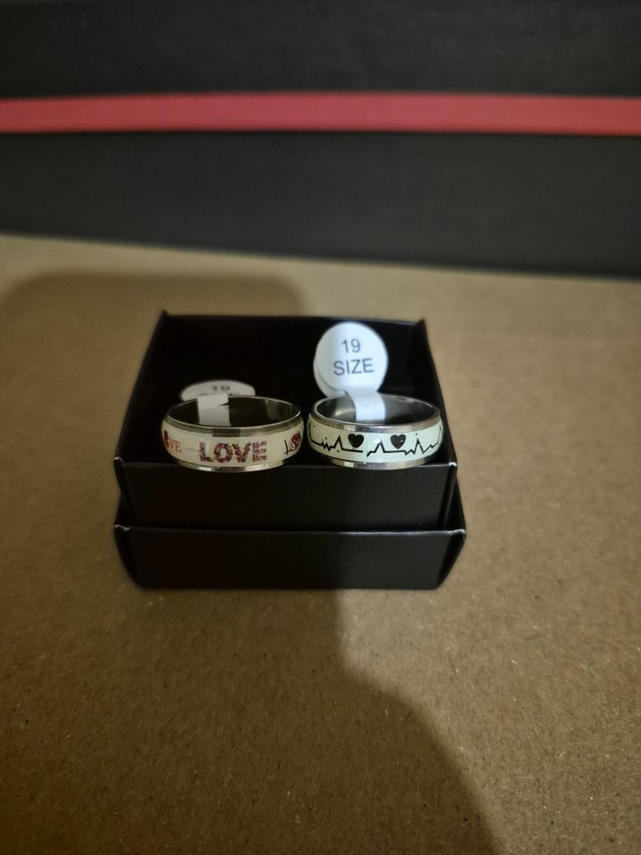 Beyaz renkte ve üzerinde 'LOVE' yazısı bulunan, 19 numara iki adet baskılı kadın yüzük seti.