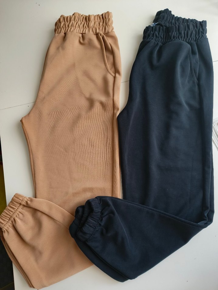 Fotoda çizgili şekiller çıkmış eşofman üstünde ama öyle bişey yok, temiz düz bir üründür. Kadınlar için açık kahverengin ve siyah sentetik yumuşak kumaştan rahat kesim eşofman altı.