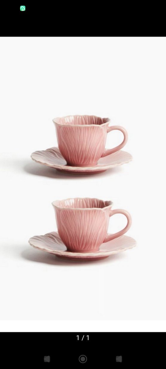 İki adet pastel pembe renkli, dokulu tasarıma sahip fincan ve tabak seti. Çay veya kahve sunumu için uygundur. ☕