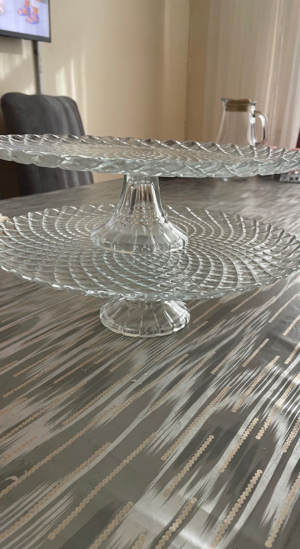 Gri soyut desenli, ayaklı cam tabak, klasik tarzda, tatlı veya atıştırmalık servisi için uygundur. ️