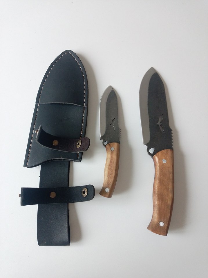 Kahverengi ahşap saplı babalı / oğullu bıçak ve siyah deri kılıf vardır . 2.5 mm kalınlığında olup kemere takılabilir.