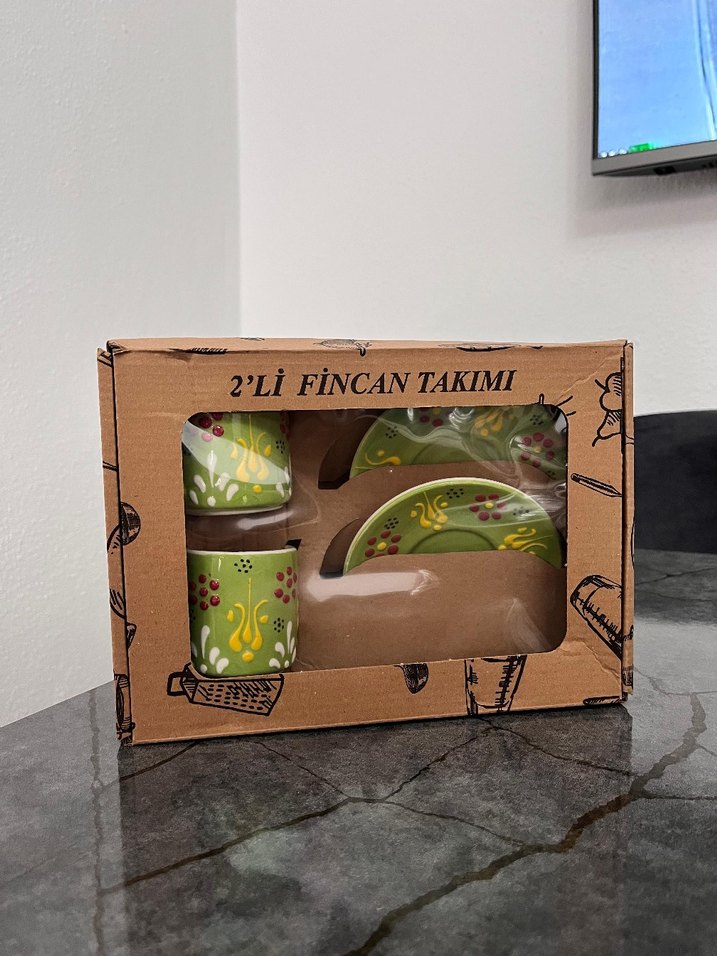 İki adet khaki renkli fincan ve uyumlu tabaklardan oluşan, koyu ve canlı desenli fincan takımı. ☕