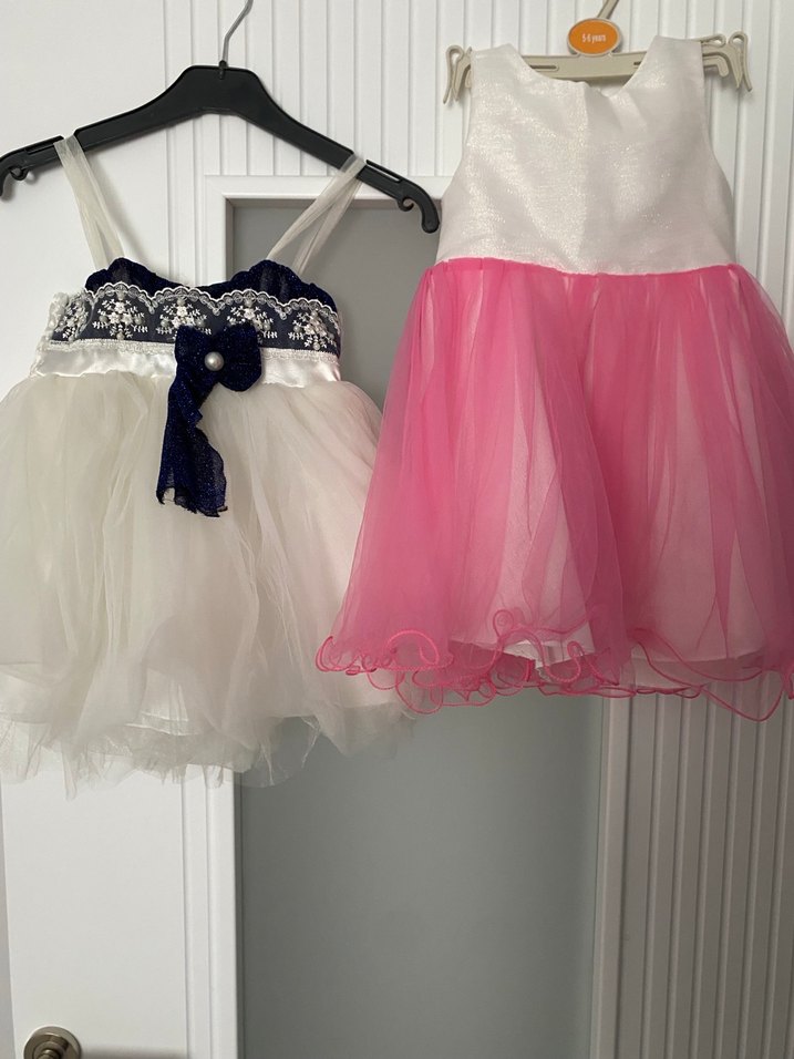 Kusurlu (Detayları okuyunuz) Beyaz/Lacivert Elbise: Askılı, göğüs kısmı işlemeli ve lacivert fiyonk detaylıdır. Etekleri kabarık tüllüdür, hiçbir sorunu yoktur. Pembe elbisenin arkasındaki fermuarın değişmesi ya da tamir edilmesi gerekiyor (Fotoğraflarda görebilirsiniz). Bu sebeple fiyatı her iki ürün için oldukça uygun tuttum. Terziyle kolayca halledilebilir veya elinden gelenler kendisi dikebilir.