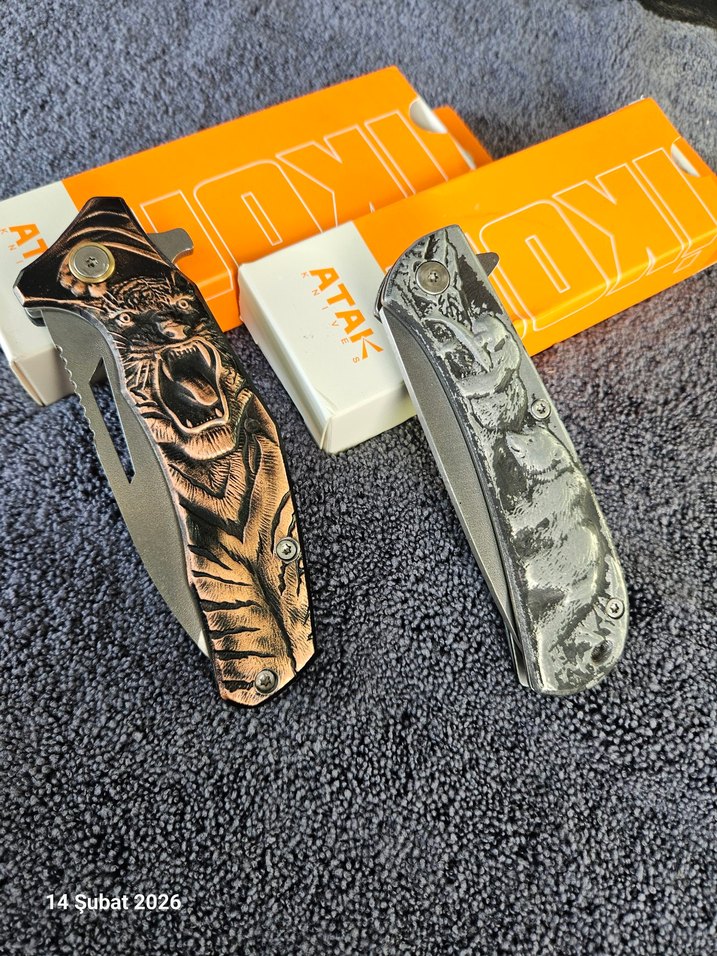 ATAK, yarıotomatik, içten kilit, kemer klipsli, kabze dahil tamamen metalden imal edilmiş çakılardır. Namlukalınlıkları yaklaşık 4mm'dir. Fiyat 2 adet çakı içindir, tekli alım için ilan açtırınız. Kaplanlı modelden siyah ve bakır renkleri mevcuttur. Renkler karma gelir, ona göre sipariş ediniz. 3 set ve üzeri alımda özel fiyat uygulanır.