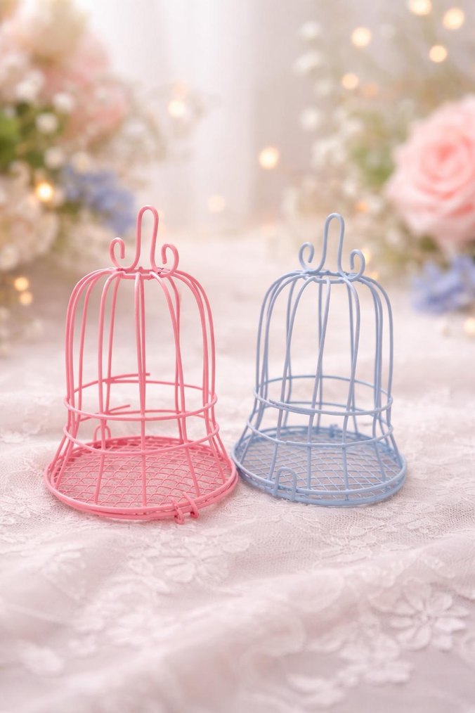 Pembe ve mavi renklerde, kafes şeklinde dekoratif metal sepetler, küçük eşyalar için uygun. iade yoktur.
