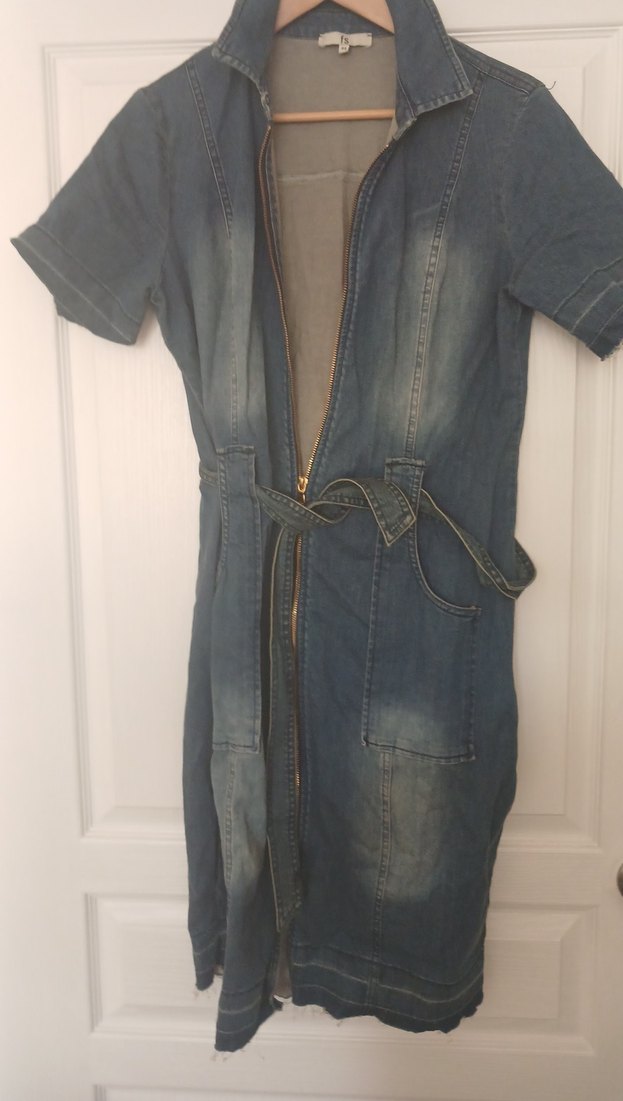 Mavi-gri tonlarda denimden üretilmiş, kısa kollu, kemerli ve normal boyda, dar kesim hamile tulumu. Günlük sokak stili için uygundur.