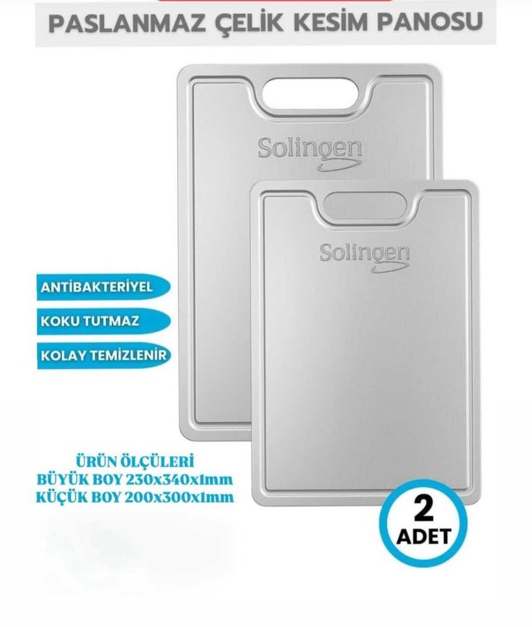 Antibakteriyel, koku tutmaz ve kolay temizlenir özellikte 2 adet gri paslanmaz çelik kesim panosu. Ölçüler: 230x340x1mm ve 200x300x1mm.