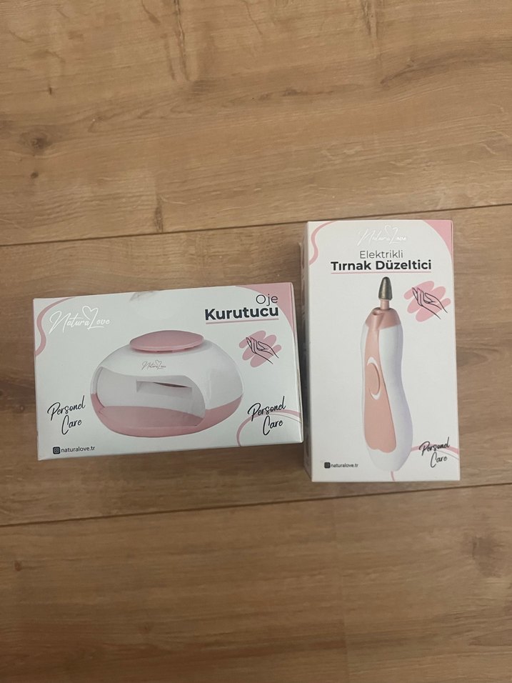 Pastel pembe renkte, kişisel bakım için elektrikli tırnak kurutucu ve tırnak düzeltici seti. Hediye olarak geldi hiç kullanılamdı