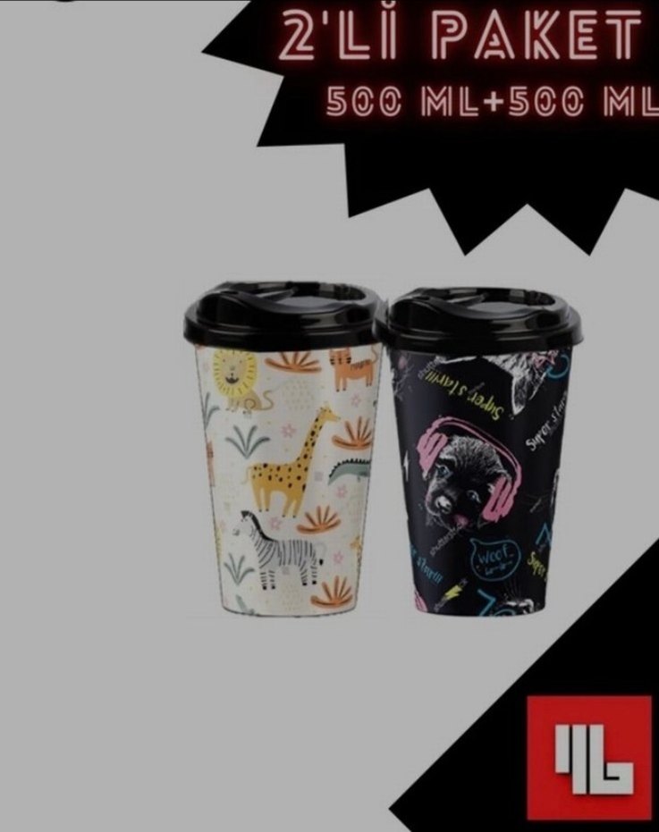İki adet 500ml kapaklı bardak seti, renkli hayvan ve köpek desenleriyle. Her bardak 500ml hacmindedir ve siyah kapaklıdır.