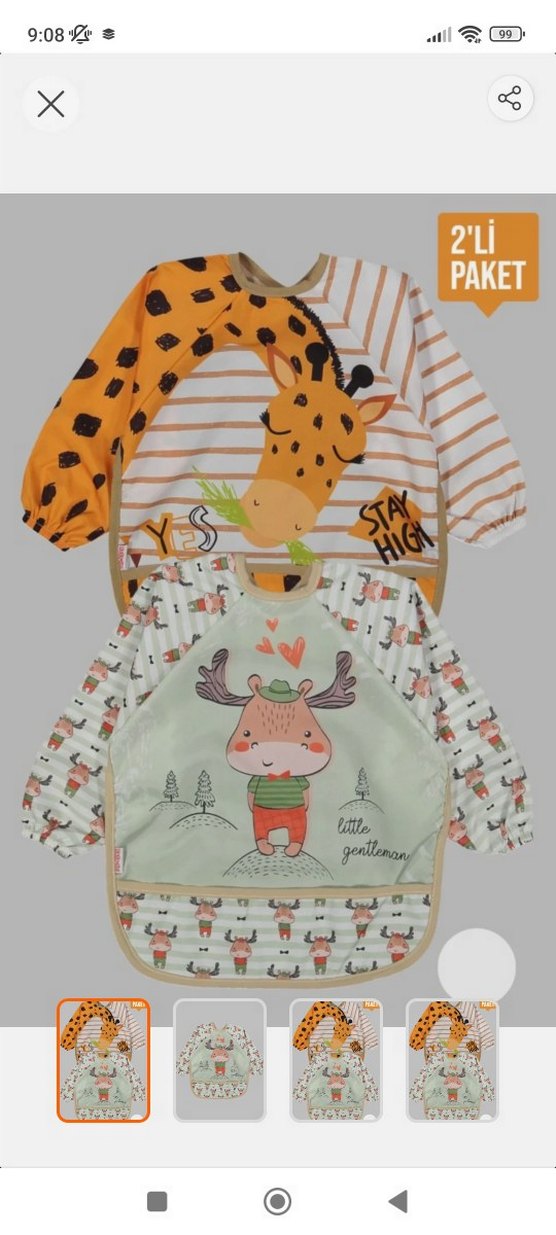 Uzun kollu, elastik manşetli 2'li renkli baskılı bebek önlüğü seti. Biri zürafa, diğeri geyik desenli, kullanışlı ve eğlenceli tasarımlar.