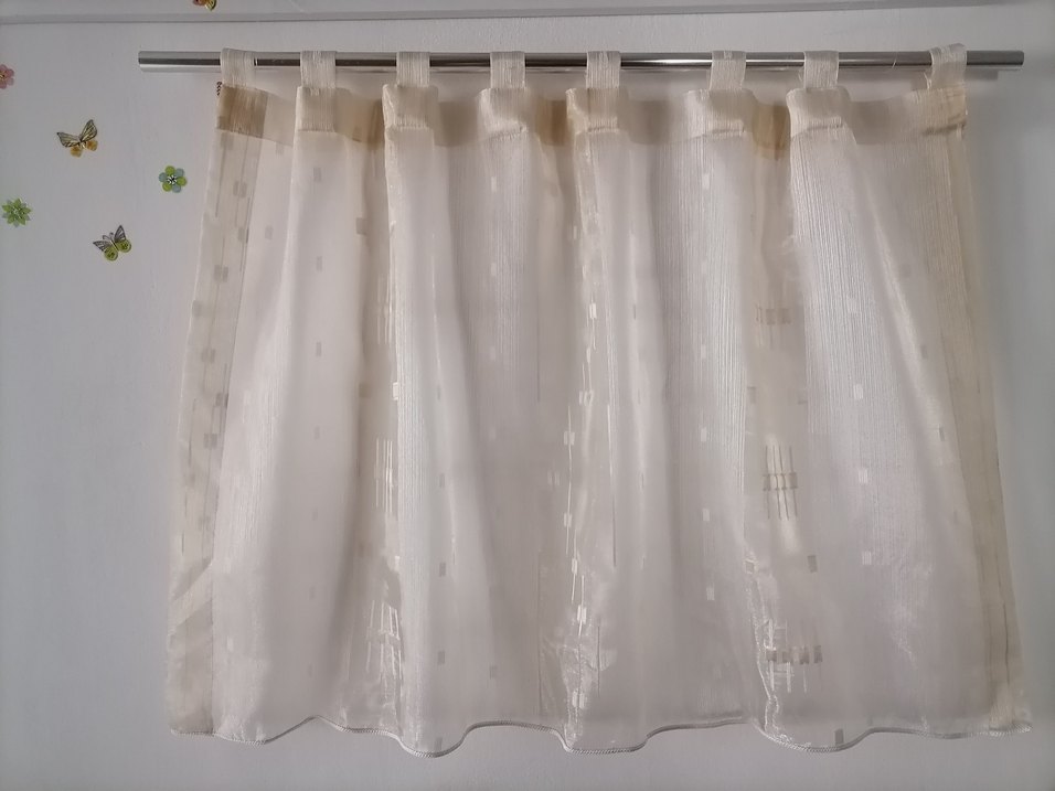 Yenidir. Küçük parça, 112 x 70 cm, büyük 176x70 cm. Uçlarında kurşun vardır. Görüntü için aleminyum çubuğa taktım. Rengi bal köpüğü ve krem rengidir.