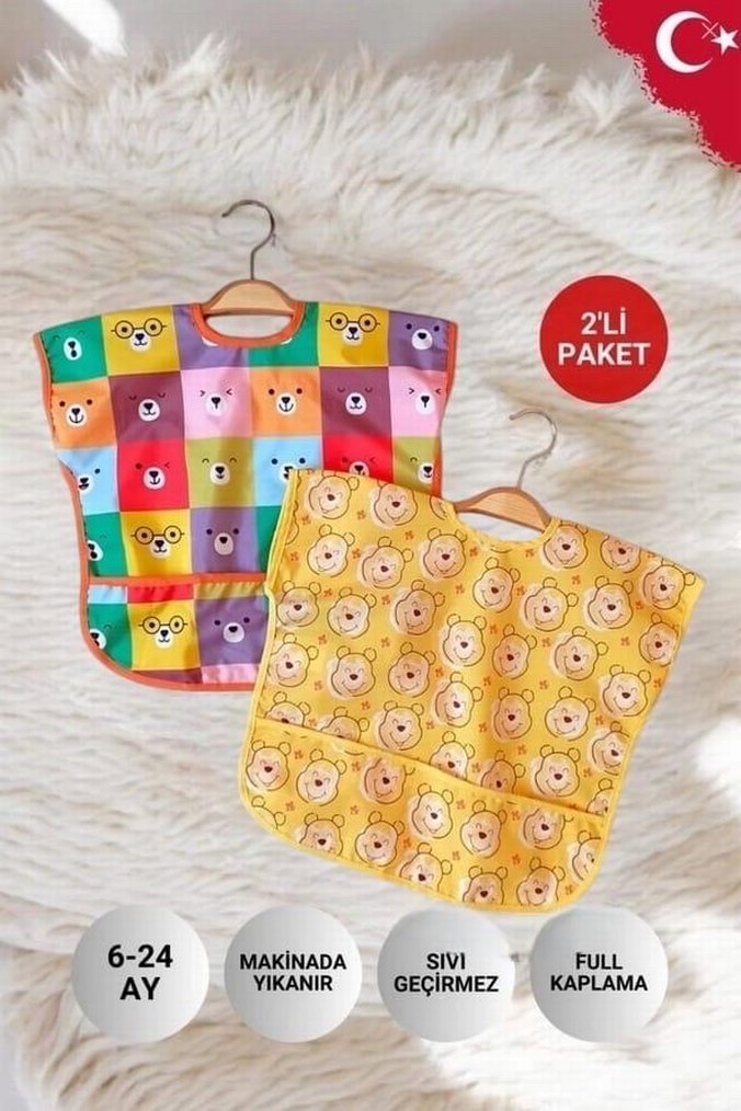 0-24 ay arası bebekler için, makinede yıkanabilir, sıvı geçirmez ve tam kaplama özellikli 2'li renkli bebek önlüğü paketi.