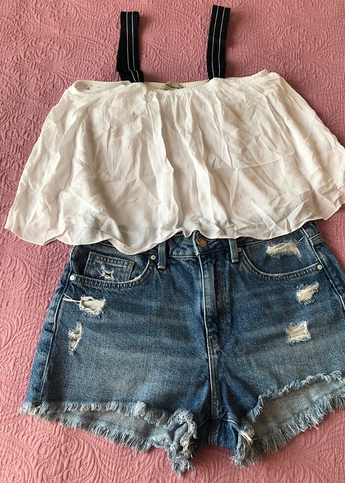 Ürün bir kaç defa kullanılmıştır.Defosu yoktur.Bluzun markası Pull&Bear şortun Mavidir.