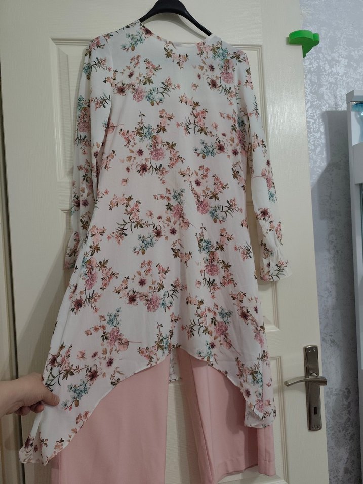 Uzun kollu, V yakalı ve drapeli, pastel pembe çiçek desenli, yumuşak sentetik kumaştan yapılmış 2 li pantolon tunik takım. hamilelik ve doğum sebebiyle satıyorum