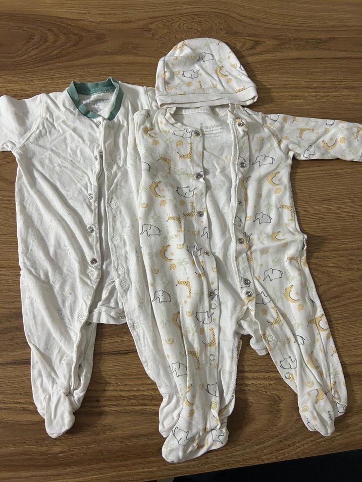 2 adet Yumuşak ve sıcak kumaştan yapılmış, düğmeli uzun kollu beyaz bebek erkek hastane tulumları. Hayvan desenli set ve uyumlu şapka dahildir. Hafif yıpranmışlık var ikisinde de ama kullanıma engel yırtık vs yok.