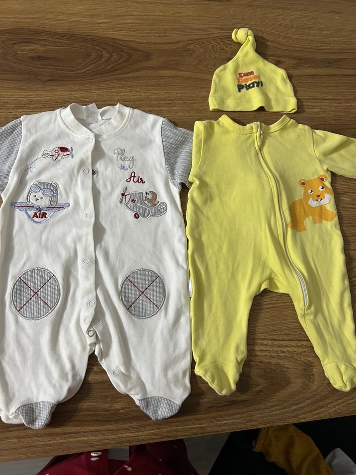 2 adet tulum biri şapkalı. Beyaz olanı hiç giydirmedim sadece yıkadım. Sarı olanı kullandım. Yakasında hafif bir leke gibi bir şey var fotoğraf çekerken farkettim. Onun dışımda ikisi de tertemiz. Biri yeni doğan biri 3 ay .