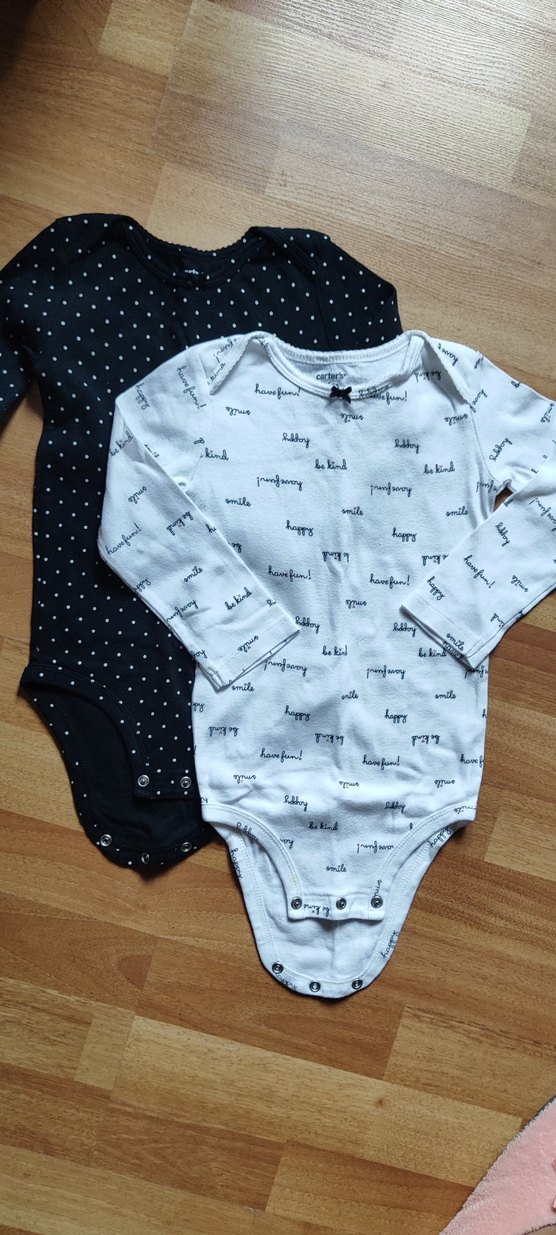 Uzun kollu, siyah üzerine beyaz puantiyeli bebek body. V yaka ve düğmeli kapama özelliğine sahiptir.