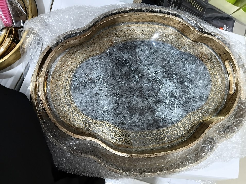 2 li Gri yılan desenli, altın renkli klasik tarzda süslü kenarlara sahip tepsi.