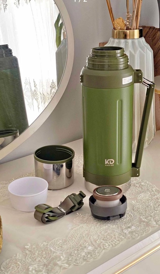 KD marka haki renk dağcı termosu, sağlam tutma sapı ve taşıma kayışı ile birlikte gelir. İçecekleri sıcak ve soğuk tutar. Süzgeçlidir.
