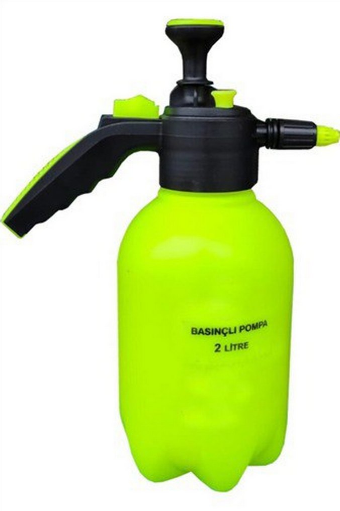 2 litrelik kapasiteye sahip sarı basınçlı pompa, kolay kullanım için konforlu tutacağa ve kontrollü püskürtme sağlayan başlığa sahiptir.
