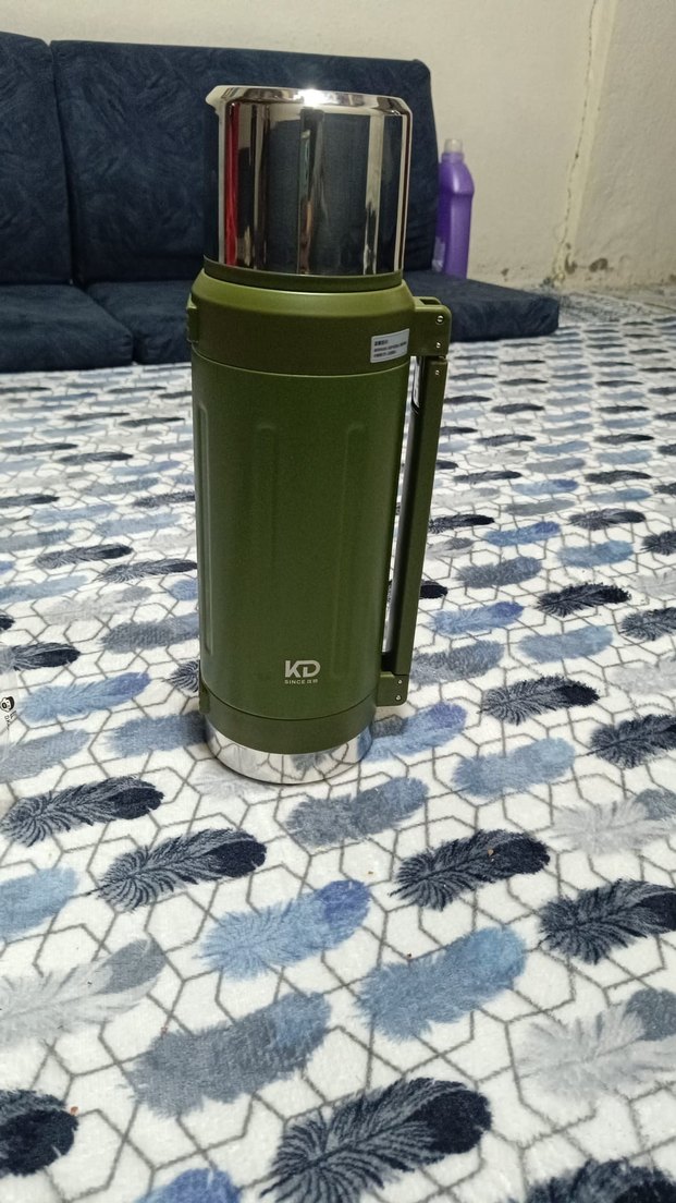 Khaki renkte çocuk termosu, sağlam tutma sapı ve güvenli kapak ile içeceklerin sıcak kalmasını sağlar. Taşıması pratiktir.