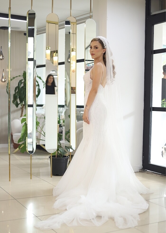 Ürün 3 model (helen ve balık) modeldir.Son gelen modelindendir.Faturası duruyor.1 defa giyilmiştir.Hasarsızdır.Duvak özel yapımdır.Ayrıyetten ücretlendirilecektir.Kristal işlemelidir.Kollardan giyilen tül üst ile helen olmaktadır.Ufak dolgu taktırdım isteğe göre sökülebilir. Aysiradan alınan gelin tacım isteğe göre satın alınabilir.