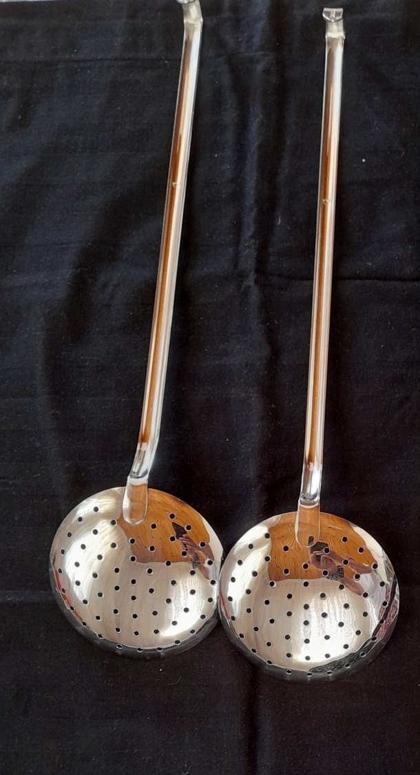 güren restfri marka 40 cm saplı, paslanmaz çelik 2 adet delikli kevgirler. Sıvıları süzmek için uygundur ve yansıtıcı yüzeyi şık bir görünüm sağlar. not: belirttiğim 2 adet fiyatıdır.