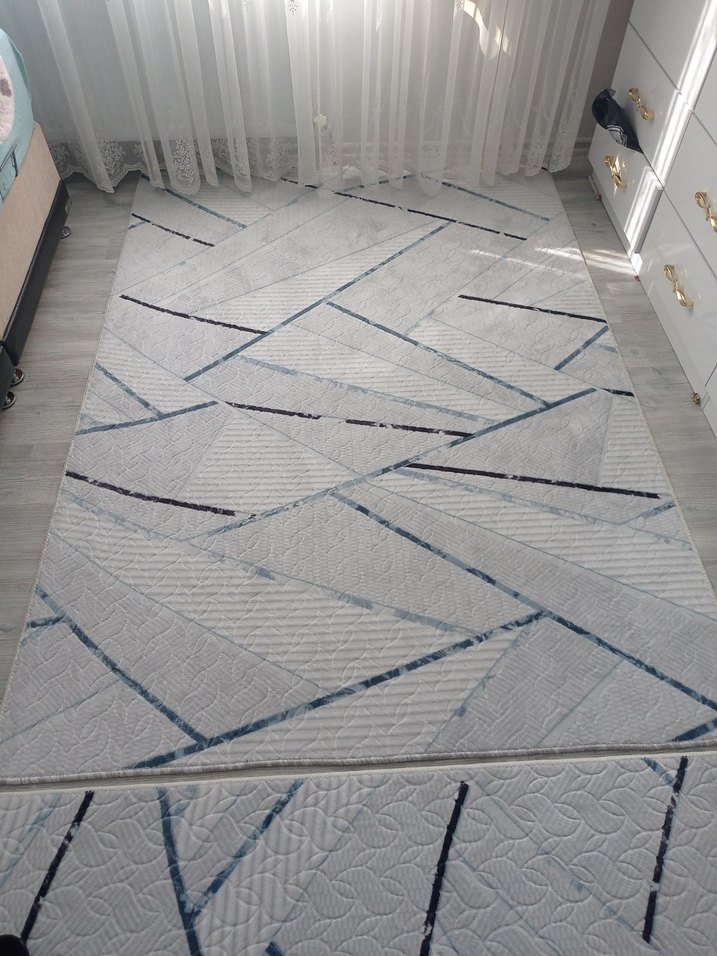 Gri ve beyaz soyut desenlere sahip bu modern halı, geometrik çizgilerle şık bir görünüm sunar. ölçü uymadgndan kullanılmadı aldığım fiyatın aşagısna veriyorum uzun yolluk 100-300diğeri 150-210 cm dir