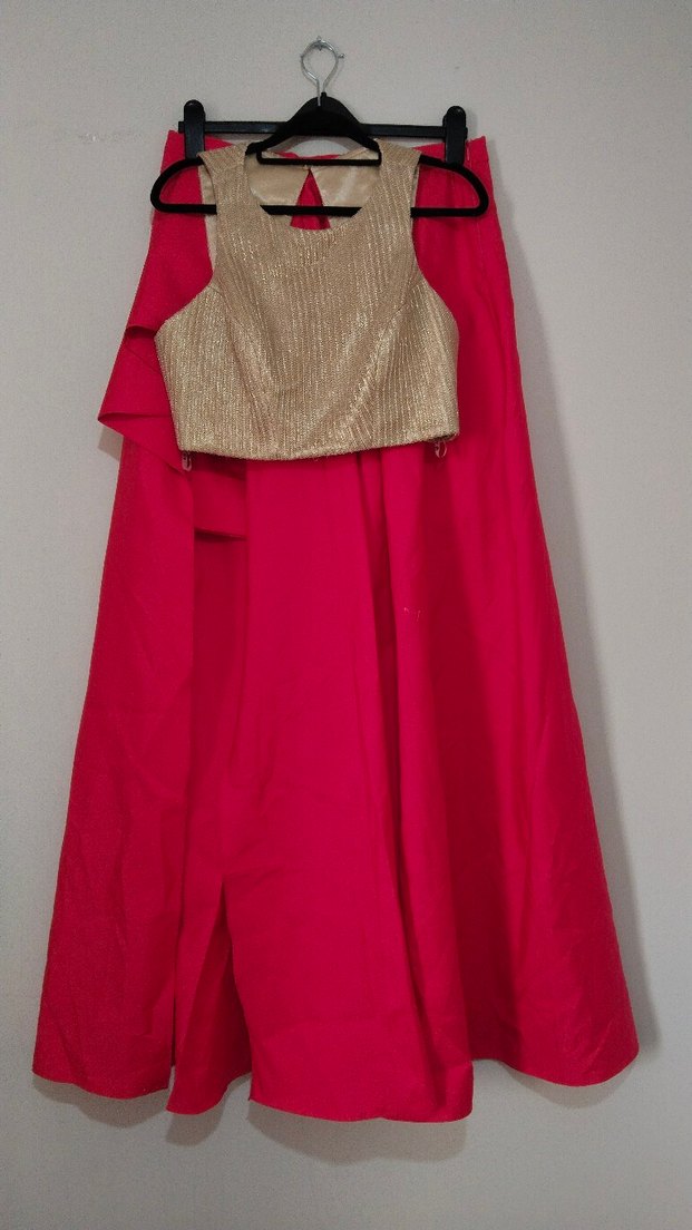 Eteği canlı Kırmızı renkte, olup üst ayrı bir takım bej renkli arkadan bağlamalı ipi kayboldu bulamadım yırtık kopuk herhangi bir deformasyonu yoktur eteği uzun derin yırtmaçlı ve iç kısımda mini eteğide mevcut çok şık duruyor 42 beden uyumlu