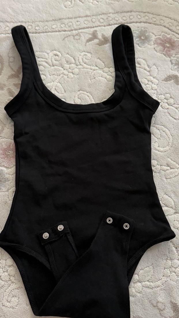 Siyah, straplez yakalı, kolsuz, vücuda oturan bodysuit. Alt kısmında kolay kullanım için çıtçıtlar bulunur. Midi uzunlukta ve desensiz.