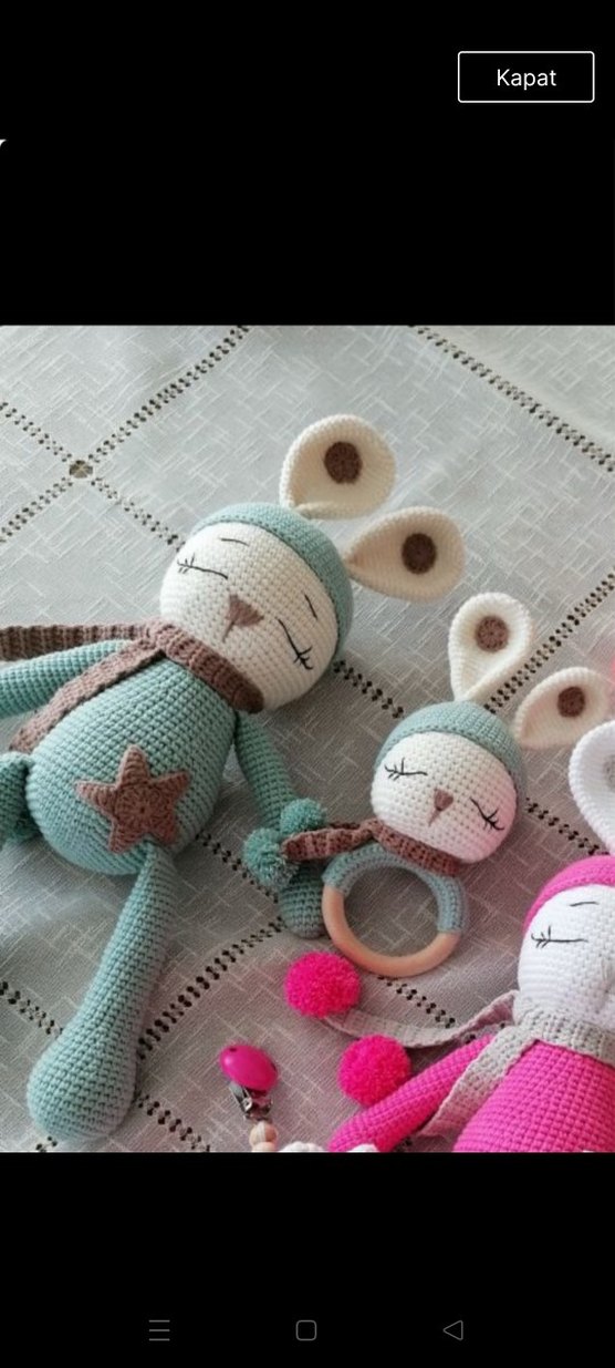 Pastel yeşil renkli, yumuşak dokulu örgü tavşan diş kaşıyıcı ve çıngırak seti, ahşap halka detaylıdır.emzik zinciri ile 2 set 6 ürün hazırlanacaktır.