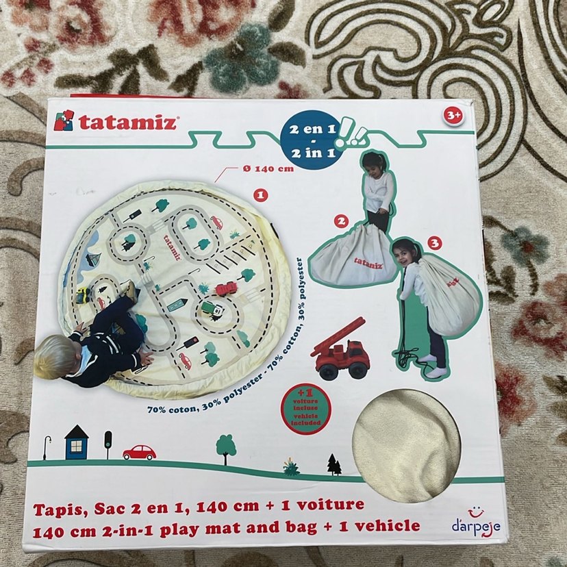 Yumuşak sentetik kumaştan yapılmış 2'si 1 arada oyun matı ve çanta, 140 cm boyunda olup küçük bir araç ile birlikte gelir. Açık renkli mat sade yol tasarımına sahiptir.