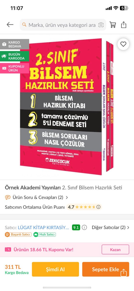 Bütün öğretmenlerin önerisiyle aldığımız çok faydalı bi set. Bi kaç işaretleme var kurşun kalemle oda silinip tekrar kullanılabilir. Yeni sayılır kızım biraz baktı sadece 2. Sınıf öğrencileri için hazırlanan set; hazırlık kitabı, tam çözümlü 5'li deneme ve Bilsem soruları nasıl çözülür rehberi içerir.