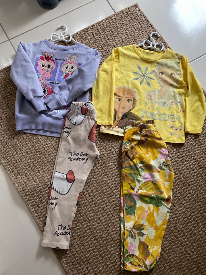 Sarı renkli, uzun kollu, yuvarlak yaka, baskılı Frozen temalı sweatshirt ve pastel tonlarda çiçek desenli, pamuklu, örgü yapıda bol kesim pantolon takımı.