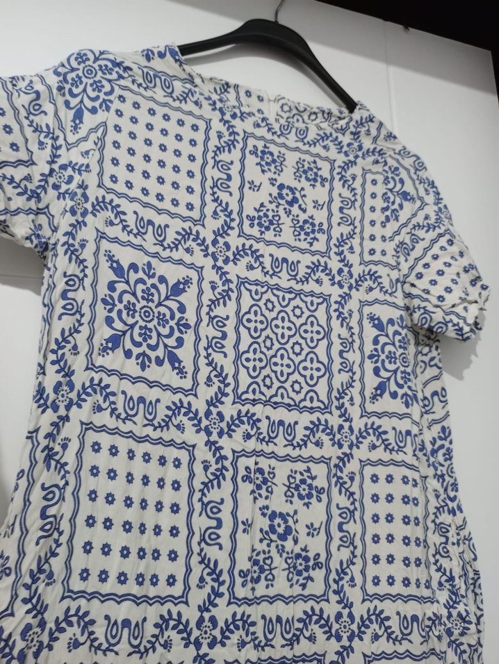 Mavi desenli, kısa kollu, yuvarlak yaka ve düğmeli, bol kesim bohem tarzda . Günlük kullanım için uygundur. 2 sinin fiyatidir