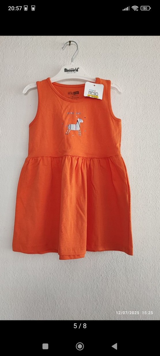 Kolsuz, turuncu kız çocuk elbisesi, bol kesim ve fırfırlı bel detayına sahiptir. Göğüs kısmında küçük zebra baskısı bulunur, yumuşak ve sıcak kumaştandır. Kolsuz, fırfırlı lacivert nakış detaylıdır. Her iki ürün de etiketlidir, ebebek ve alt markasıdır. Bedeni uymadığı için hiç giyilmedi, bu nedenle satılıktır.