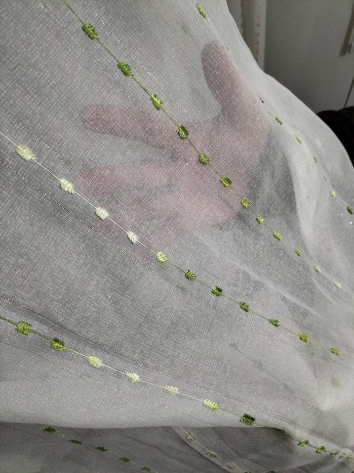 Nakışlı desenli, yesil ve turuncu tonlarında detaylara sahip beyaz geleneksel perde. Odaya hafif ve ferah bir hava katar. makûl ürün, defosu yok...