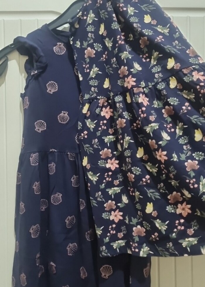 Resimlere bakınız. iki elbise Almanyadan. İlk elbise H&M den, Deniz kabukları parlıyor. Tek tük deniz kabuğunda aşınma var ama göze gelmiyor. 2.elbise manguun marka, arkası dantel ayrıntılı. 134 cm beden ikiside