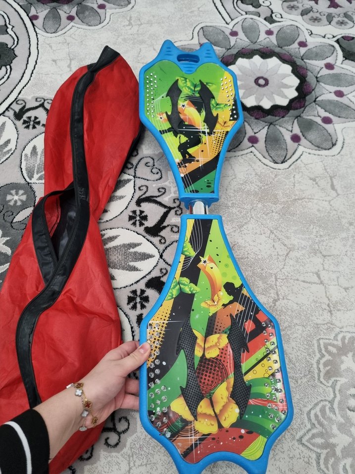 Canlı renklerde, sağlam yapılı kaykay kolay taşıma için kırmızı taşıma çantası ile birlikte gelir. usta kaykayları 2 tekerlekli