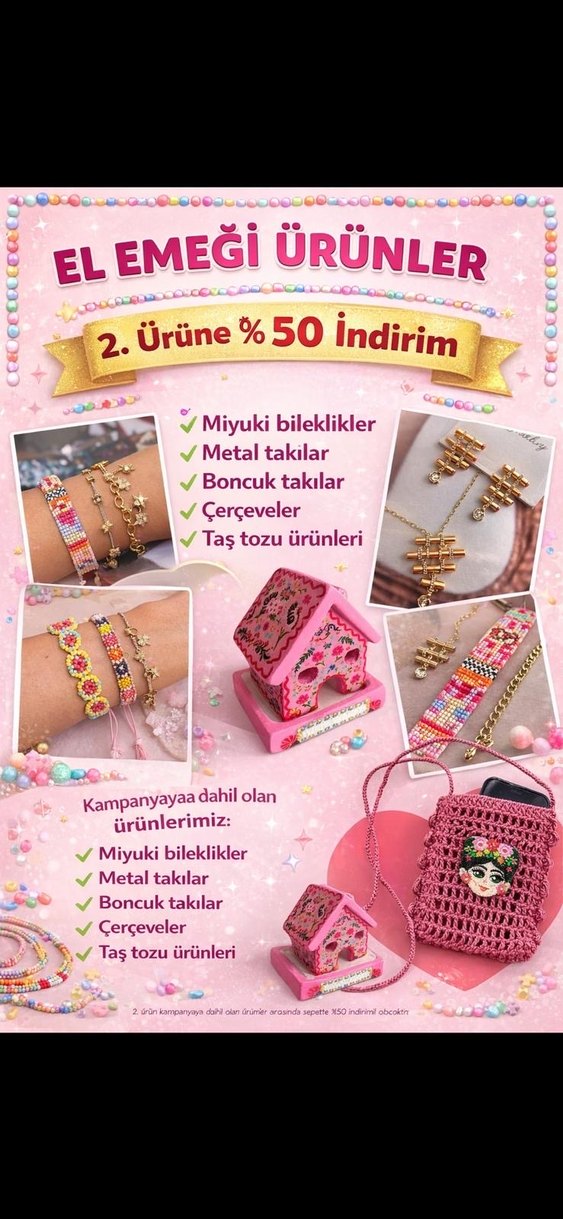 Kampanyamızda fiyatı düşük olan ürünün % 50 indirime dahil olacaktır. Kampanyamıza dahil olan ürünlerimiz el emeği olan ürünlerimizi kapsamaktadır. Kampanyaya dahil olan kategorilerimiz miyuki boncuk ürünler, boncuk takılar, taş tozu ürünler ( boyalı ya da boyasız ), metal takılar, boncuk çanta, çerçeveler. Not: Gümüş takılar kampanyaya dahil değildir. Taş tozu boyalı ürünlerde 2 gün üretim siresi vardır. #kampanya#takı#toka#miyuki#çerçeve