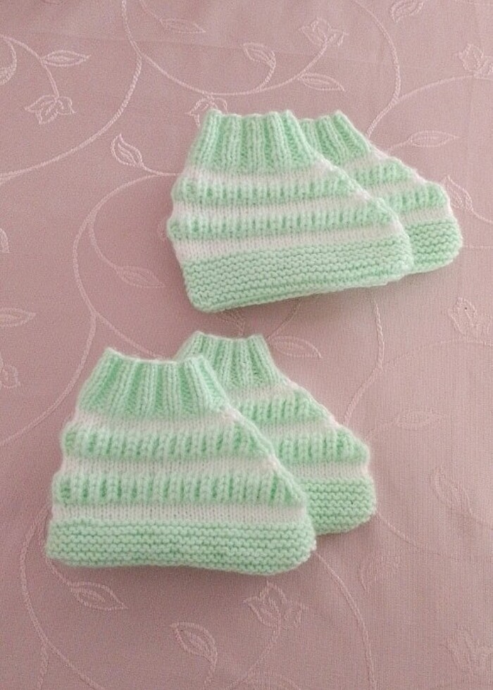 2 çift patik el örgüsü hiç kullanılmamış Biri 2-3 yaş arası Diğeri 3-4 yaş arası için uygun Hem kızlara hem erkeklere uygun su yeşili beyaz
