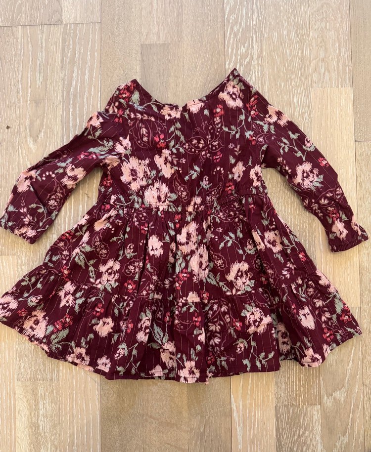 Osh kosh marka 2 yaşa uygun, uzun kollu, bordo, çiçekli elbise. İnce bir kumaşı var. Beli lastikli.